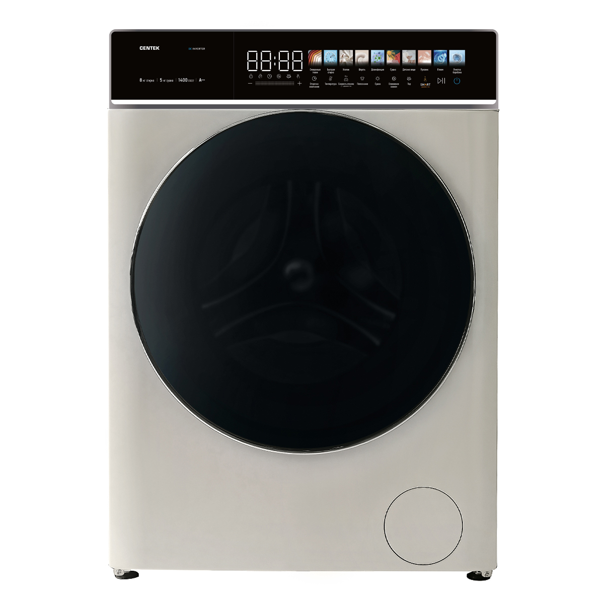 CENTEK СТ-1946 с сушкой экономит место, время и средства. Благодаря сенсорному управлению и информативному LED-дисплею управлять машиной можно в одно касание. Инверторный двигатель обеспечивает бесшумную работу, высокую энергоэффективность А+++, и мощность 2000 Вт.