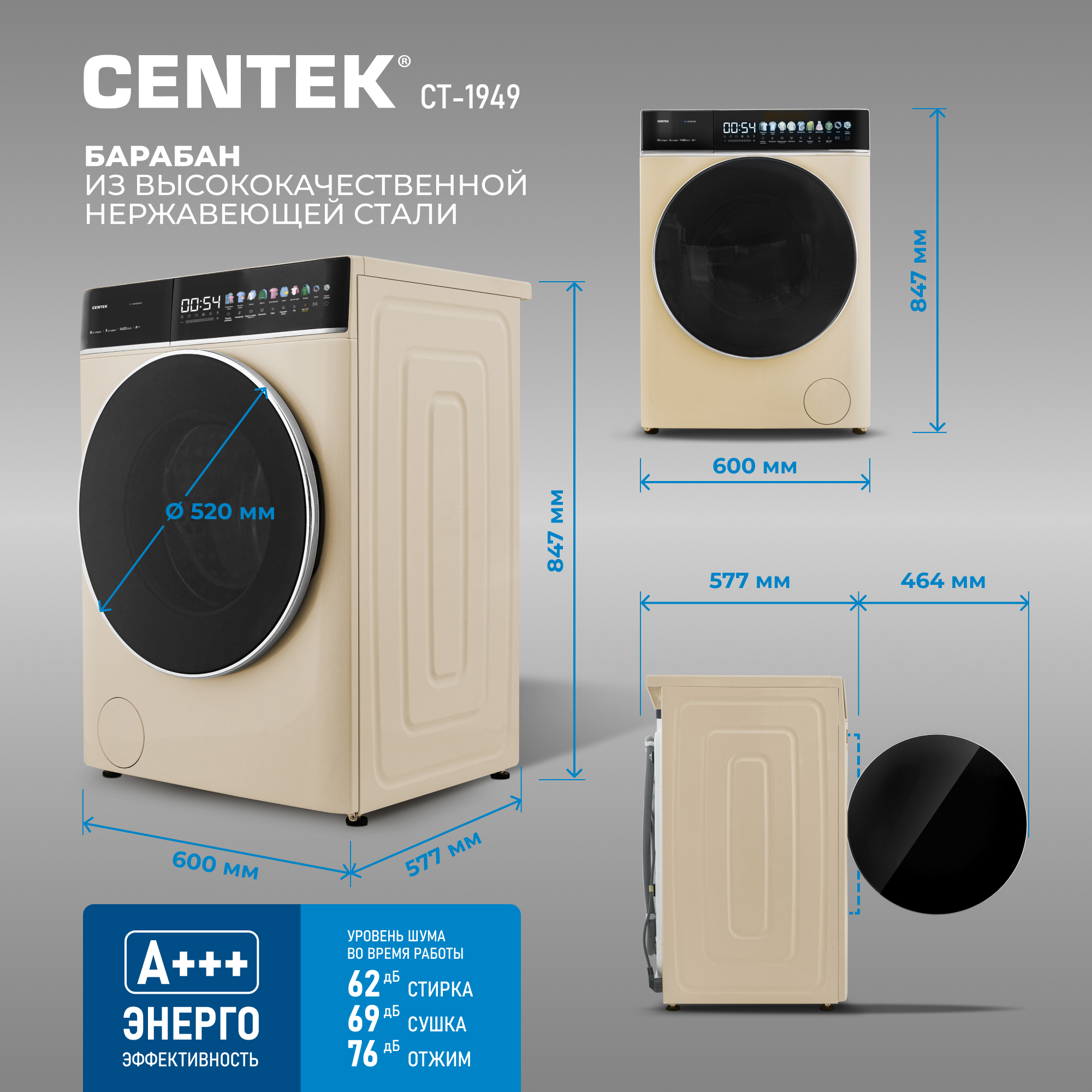 CENTEK INVERTER СТ-1949 с сушкой экономит место, время и средства. Благодаря сенсорному управлению и информативному LED-дисплею управлять машиной можно в одно касание. Инверторный двигатель обеспечивает бесшумную работу, высокую энергоэффективность А+++, и мощность 2000 Вт.