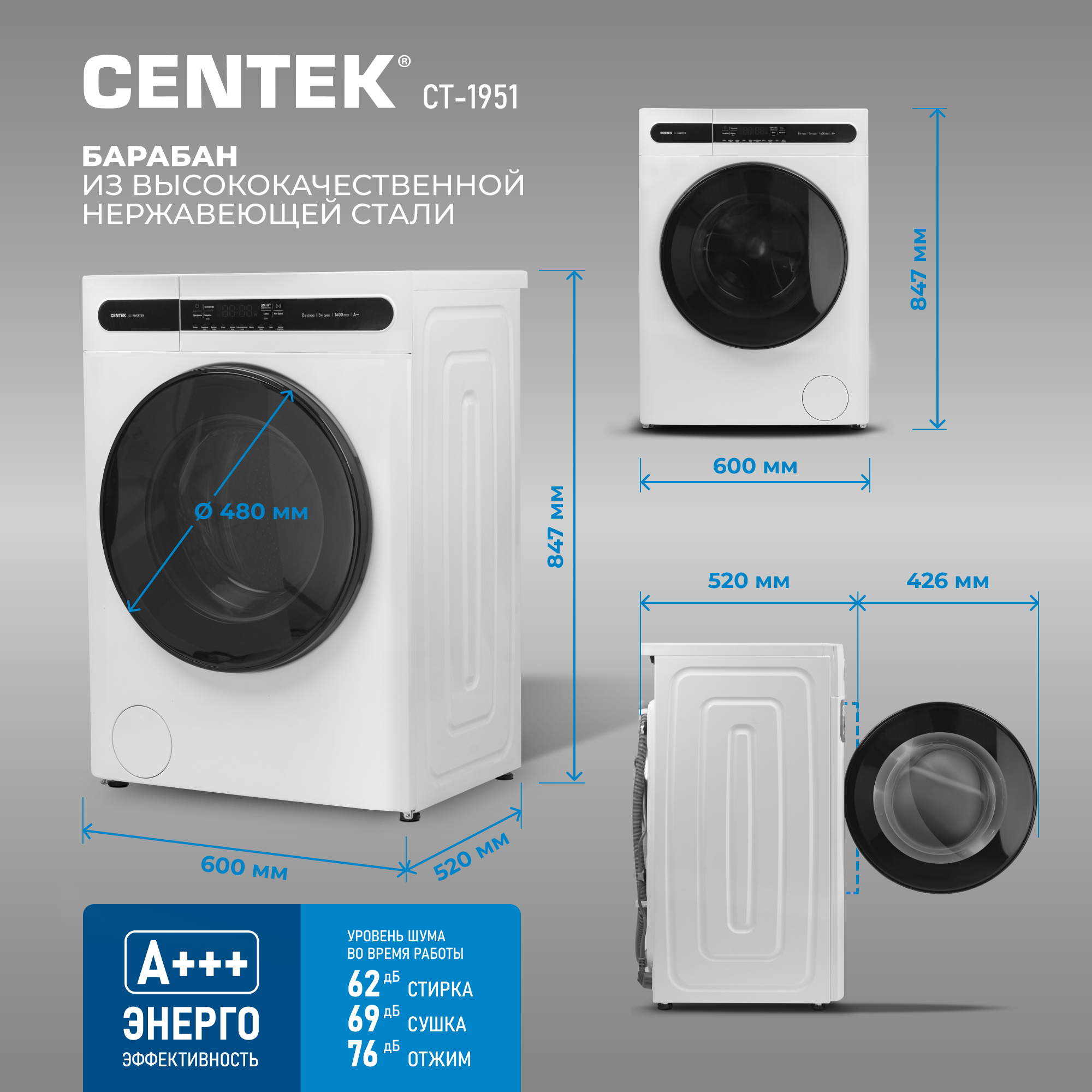CENTEK INVERTER СТ-1951 с сушкой экономит место, время и средства. Благодаря сенсорному управлению и информативному LED-дисплею управлять машиной можно в одно касание. Инверторный двигатель обеспечивает бесшумную работу, высокую энергоэффективность А+++, и мощность 1400 Об/мин. Данная модель оснащена специальной системой, которая способна распознавать неравномерное распределение белья в барабане, и исключает разбалансировку двигателя. Помимо основных функций, машина оснащена: функцией «Дозагрузка белья», отсрочкой старта, функцией «Блокировка от детей», функция «Гипоаллергенная стирка», функция «SMART» (если вы устали, торопитесь или просто не хотите ломать голову, подбирая параметры стирки, машина может сделать это за вас. В режиме SMART стиральная машина оценивает параметры загруженного белья и самостоятельно подбирает длительность, температуру (как правило, от 20 до 40 °С), количество подциклов полосканий и т.д). Каждое изделие тестируется. Внутри бака могут оставаться следы воды. Это нормально.
